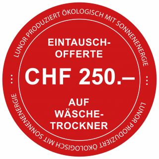 Tauschen Sie bei uns Ihren alten Raumluft-Wäschetrockner gegen einen neuen effizienten LUNOR-Wäschetrockner ein und profitieren Sie von CHF 250.- Rabatt.